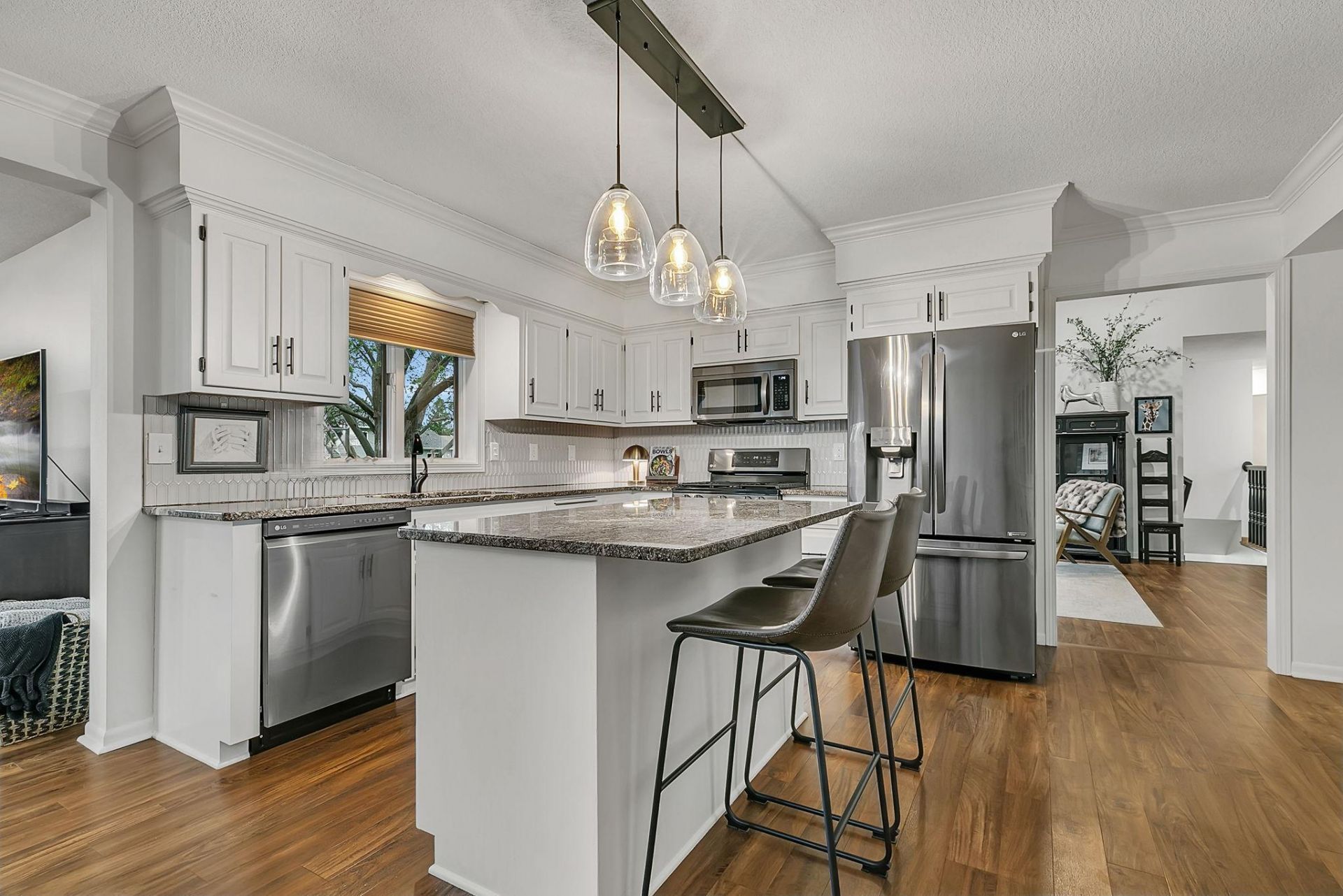 Step into this beautifully refreshed rambler in Sartell's popular Morningstar neighborhood and you will immediately see the thoughtful updates, starting with the hard floors and knock-down ceiling in the spacious living room. The kitchen has been tastefully modernized with white painted cabinets, black hardware, stainless steel appliances, and updated lighting for a clean, modern feel. Just off the dining room is the bright sunroom with vaulted ceilings and numerous windows that fill the space with natural light. The home's ideal layout has three bedrooms upstairs, including a primary suite with updated tile shower and walk-in closet, along with a full hall bath, and there is a convenient main-floor laundry. The finished lower level expands your living space with two additional bedrooms, a full bath, and a large family room anchored by a gas fireplace. There is also a dedicated exercise area plus a workshop/storage room to meet all your needs. Outside, enjoy a fantastic, fenced backyard complete with a patio and landscape curbing. The garage is finished and is a massive 30 ft deep and offers steps to the basement. This move-in-ready home combines classic rambler convenience with stylish updates.