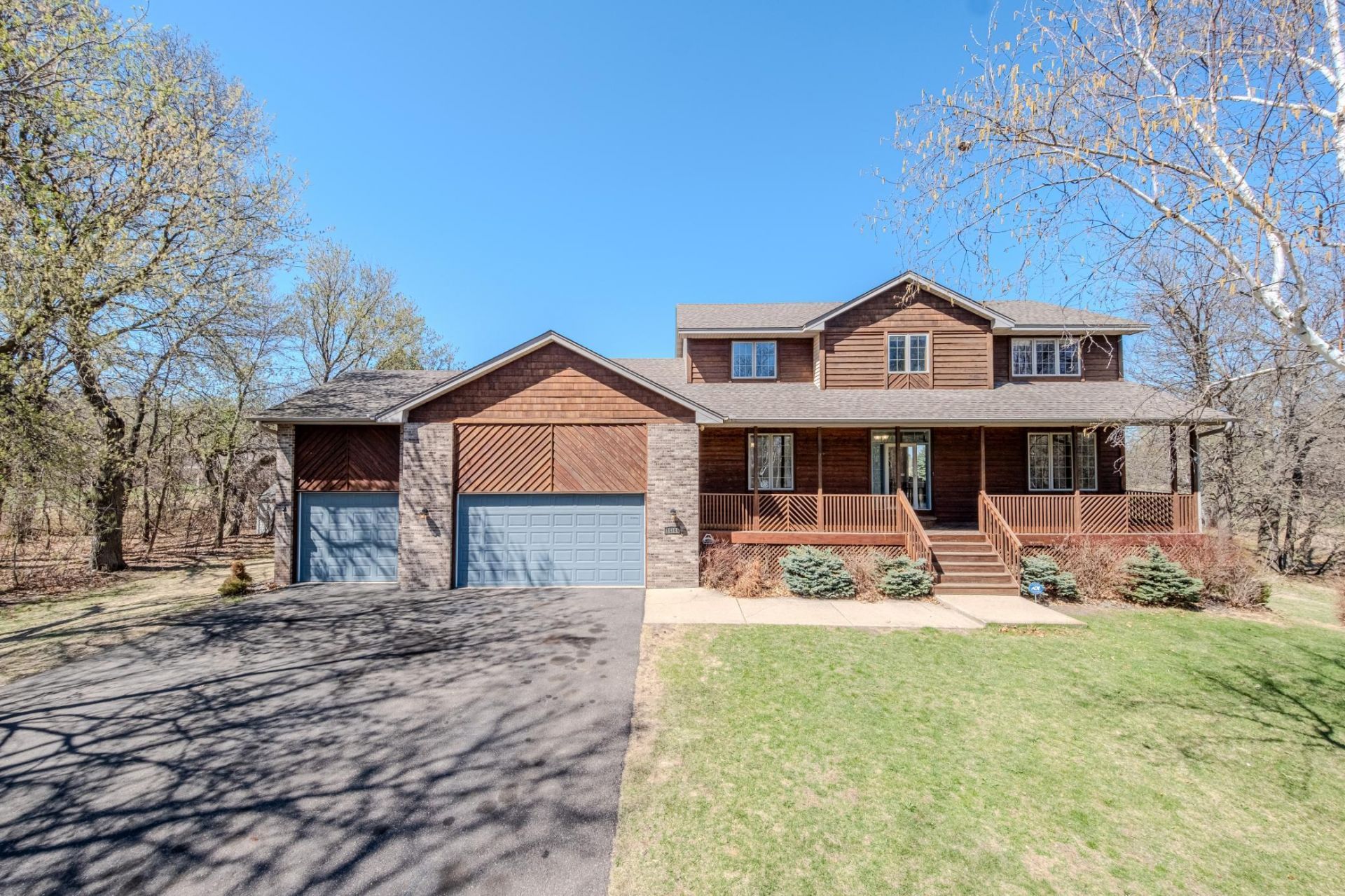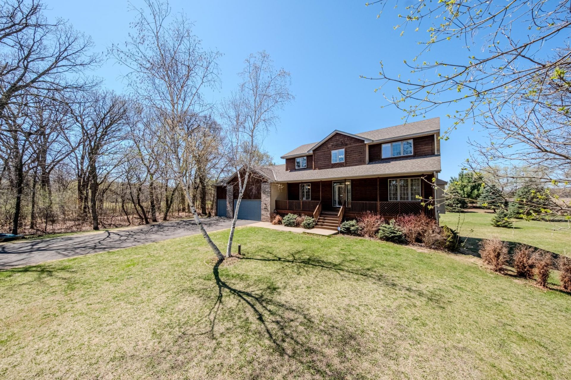 Nestled among mature trees on 2.15 private acres, this spacious two-story rustic-style home welcomes you with a charming wood exterior and a wide front porch, perfect for sipping morning coffee and watching the sunrise.A peaceful pond graces the side, inviting local wildlife and offering a tranquil retreat in nature.A winding walkway leads guests through lush greenery to the entrance, while a massive 29x13 deck provides a stunning setting to relax in privacy with no neighbors behind you, entertain with peace of mind, or enjoy breathtaking sunsets over the landscape. Garden enthusiasts will delight in the backyard greenhouse, and a shed provides ample storage for tools and outdoor gear.Inside, four roomy bedrooms are upstairs, including a primary suite with a private luxurious ensuite bath. The main level embraces plenty of space for gatherings in the living and dining quarters, as well as an open kitchen with all new quartz countertops, gleaming backsplash, farmhouse sink, stainless steel appliances, repainted cabinets, and new hardware.Cozy gas fireplaces on both levels create warmth and comfort, and the expansive family room offers space for play, movie nights, or even a recreation room. Multiple driveway parking spots and a large garage make welcoming guests easy in this quiet, nature-filled neighborhood.Convenient access to Hwy 65, nearby shops, local attraction sites, lakes, golf clubs and more!